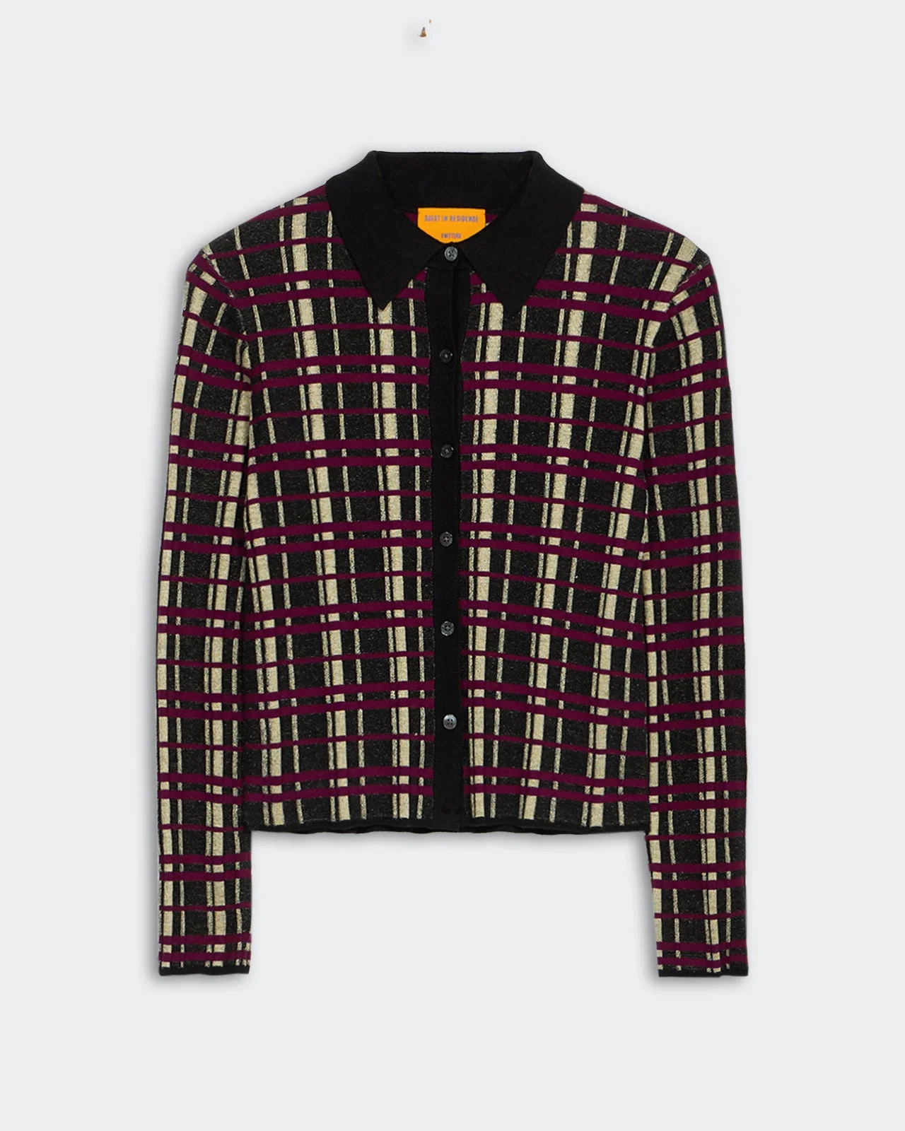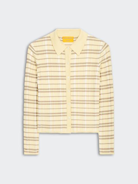 - LIGHT-WEIGHT RIB PLAID ELLE SHIRT - SHIRT COLLAR WITH STAND AND FRONT BUTTON-UP CLOSURE - Signature GIR branding at center back - 70% SILK 30% LINEN BLEND - ELLA IS 5' 11" / 180 CM and is wearing a Small.
