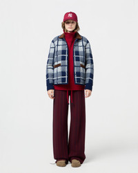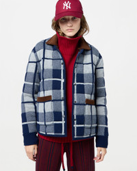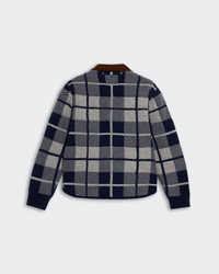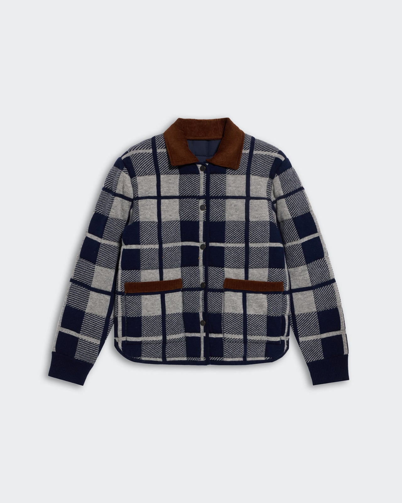 - Cashmere blend plaid jacket - Quilted, insulated jacket - Mid-weight - Reversible - Detachable corduroy collar - Recycled polyester lining - Two front pockets with corduroy trim - Jacquard plaid knit design - Front closure with metal snaps - Curved shirt-tail hem - Solid color rib sleeve cuff - Inside pockets - Signature gir branding at center back - 70% mercerized wool, 30% cashmere - NADINE IS 5' 9" / 175 CM and is wearing a Small.