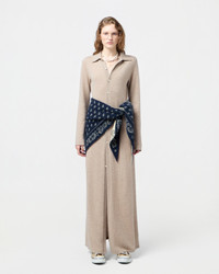 - LIGHT-WEIGHT JERSEY SHIRT DRESS - LONG DRESS FIT AS SHOWTIME SHIRT DRESS - SHIRT COLLAR WITH STAND AND FRONT BUTTON UP CLOSURE - Signature GIR branding at center back neck - 100% CASHMERE - FLOOR IS 5' 10" / 178 CM and is wearing a small. - Premium cashmere sourced from inner Mongolia, manufactured in China