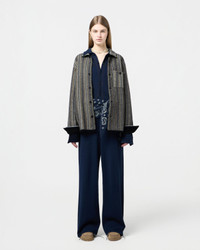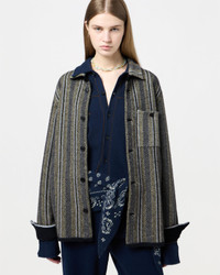 - Unisex cashmere button-down sweater - Mid-weight - Three color vertical stripe jacquard stitch - Shirt collar - Front patch pockets with button flap - Front button closure - Button sleeve cuff with placket - Signature gir branding at center back - 9 Gauge - 100% cashmere - Premium cashmere sourced from inner Mongolia, manufactured in China - Yana is 5' 10" / 178 CM and is wearing a size medium. - BRADLEY IS 6' 2.5" / 189 CM and is wearing a size medium.