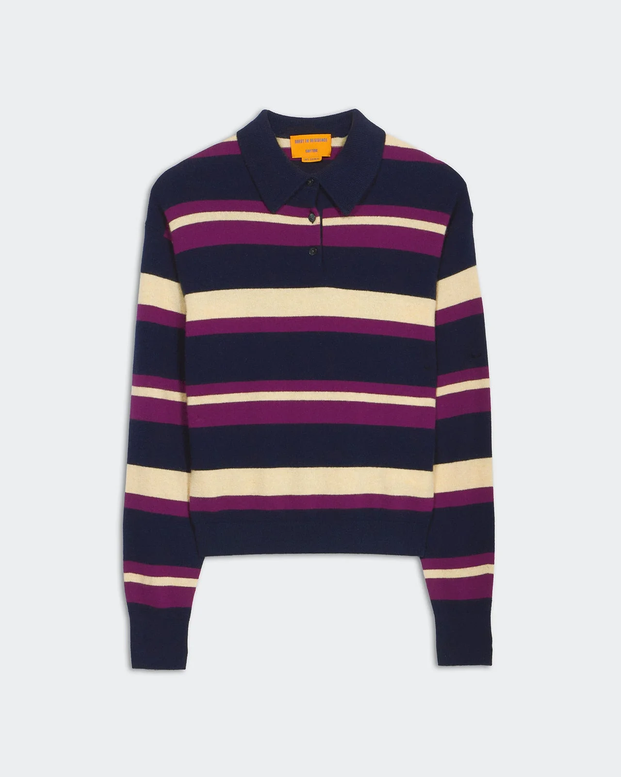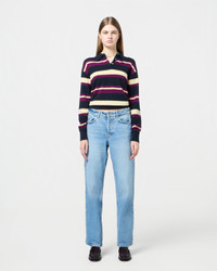 - Women's sizing, intended for a relaxed fit - LIGHT-WEIGHT JERSEY STRIPE POLO - Ribbed cuff and hem - POLO COLLAR IN RIB STITCH - FRONT THREE BUTTON PLACKET CLOSURE - Signature GIR branding at center back neck - 100% Cashmere - FLOOR IS 5' 10" / 178 CM and is wearing a Small. - Premium cashmere sourced from inner Mongolia, manufactured in China