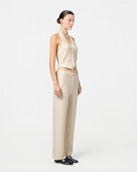 - MID-WEIGHT FITTED HALTER VEST - FRONT BUTTON CLOSURE - CONTOURING DARTS - JERSEY ROLLED EDGE AT NECKLINE AND ARMHOLE - TWO SINGLE WELT FAUX POCKET DETAILS at the FRONT - ADJUSTABLE STRAP AT CENTER BACK With BUCKLE - Signature GIR branding at center back - 100% CASHMERE - ELLA IS 5' 11" / 180 CM and is wearing a Small. - Premium cashmere sourced from inner Mongolia, manufactured in China