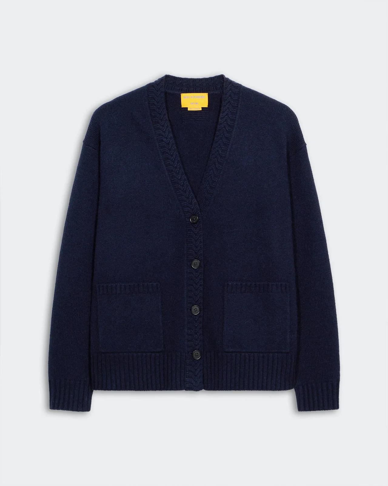 - Unisex fit to Men's sizing. Women should size down for a less oversized fit. - Medium-weight knit - Five-button closure - Racked rib stitch placket/neckline - Ribbed cuff and hem - Two front patch pockets with ribbed trim - Integral knitted branding - 100% Cashmere - Shuting is 5'10" / 178 and is wearing a Medium. - Premium cashmere sourced from inner Mongolia, manufactured in China