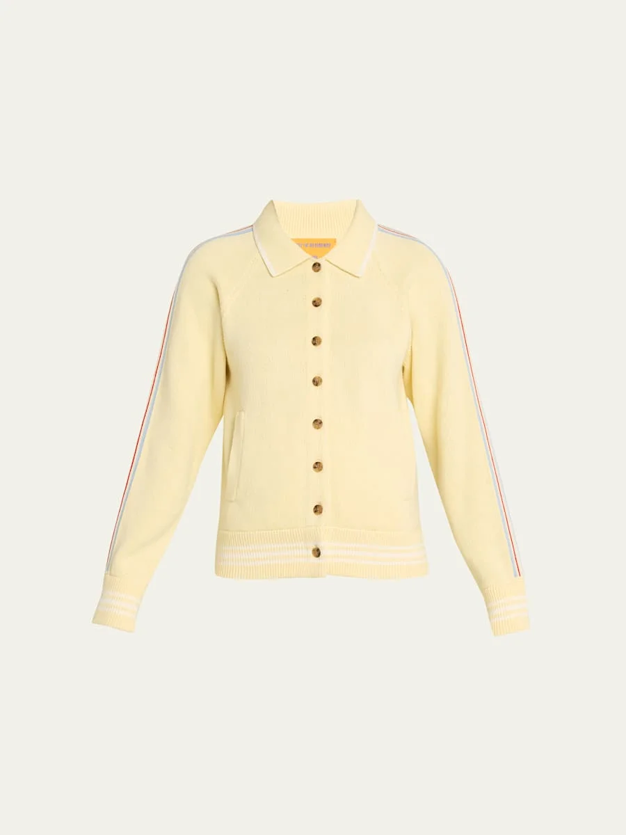 This varsityinspired jacket by Guest in Residence is crafted from a soft cottoncashmere knit with athletic stripes Approx. 22"L from shoulder to hem Spread collar; button front Raglancut long sleeves Sideentry pockets Relaxed fit Hip length Ribbed cuffs and hem Cotton/cashmere Imported SIZE amp; FITModel measurements: 5'10" tall Model is wearing a US size 4/Small