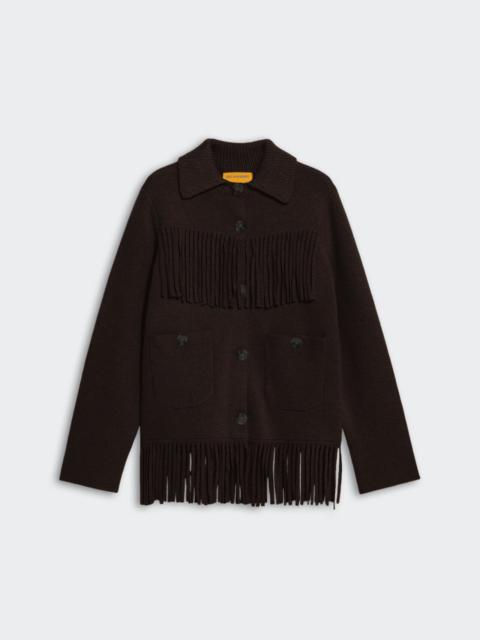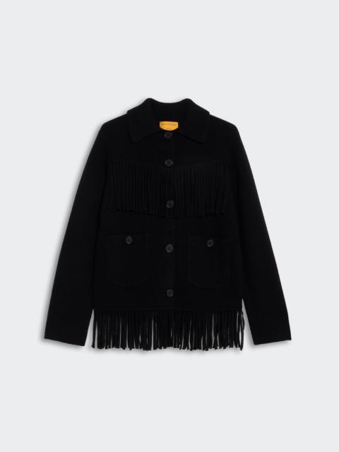 - Cashmere blend fringe jacket - Heavy-weight - Wear it solo or layer it over other pieces - Knitted western style fringe at yoke - Knitted fringe at hem - Two front patch pockets with button closure and topstitching - Elbow patch with topstitching - Signature gir branding at back neck - 5 Gauge - 70% mercerized wool, 30% cashmere - ELLA IS 5' 11" / 180 CM and is wearing a size small.