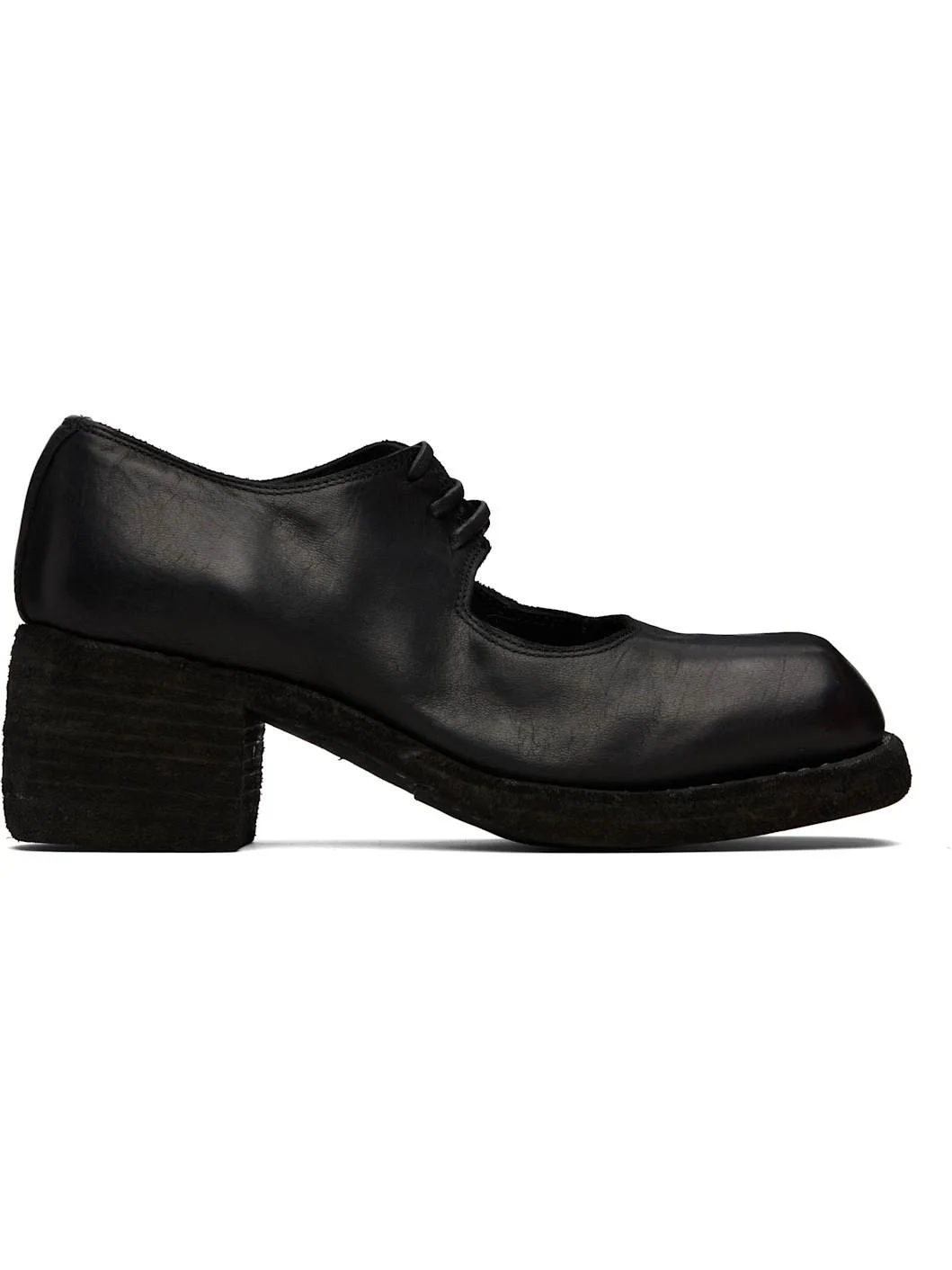 Buffed horse leather derbys. · Square toe · Cutout at vamp · Lace-up closure · Buffed leather lining · Topstitching at welt · Stacked leather block heel · Leather sole · Heel: H2.5" Supplier color: Blkt Upper: horse leather. Sole: leather. Made in Italy 252703F122001