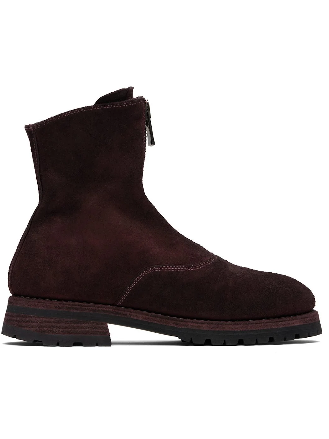 Ankle-high horse leather suede boots. · Pilling and discoloration throughout · Zip closure at vamp · Leather interior · Stacked leather and rubber midsole · Treaded Vibram® rubber sole Supplier color: Burgundy Upper: horse leather. Sole: rubber. Made in Italy 252703F113007