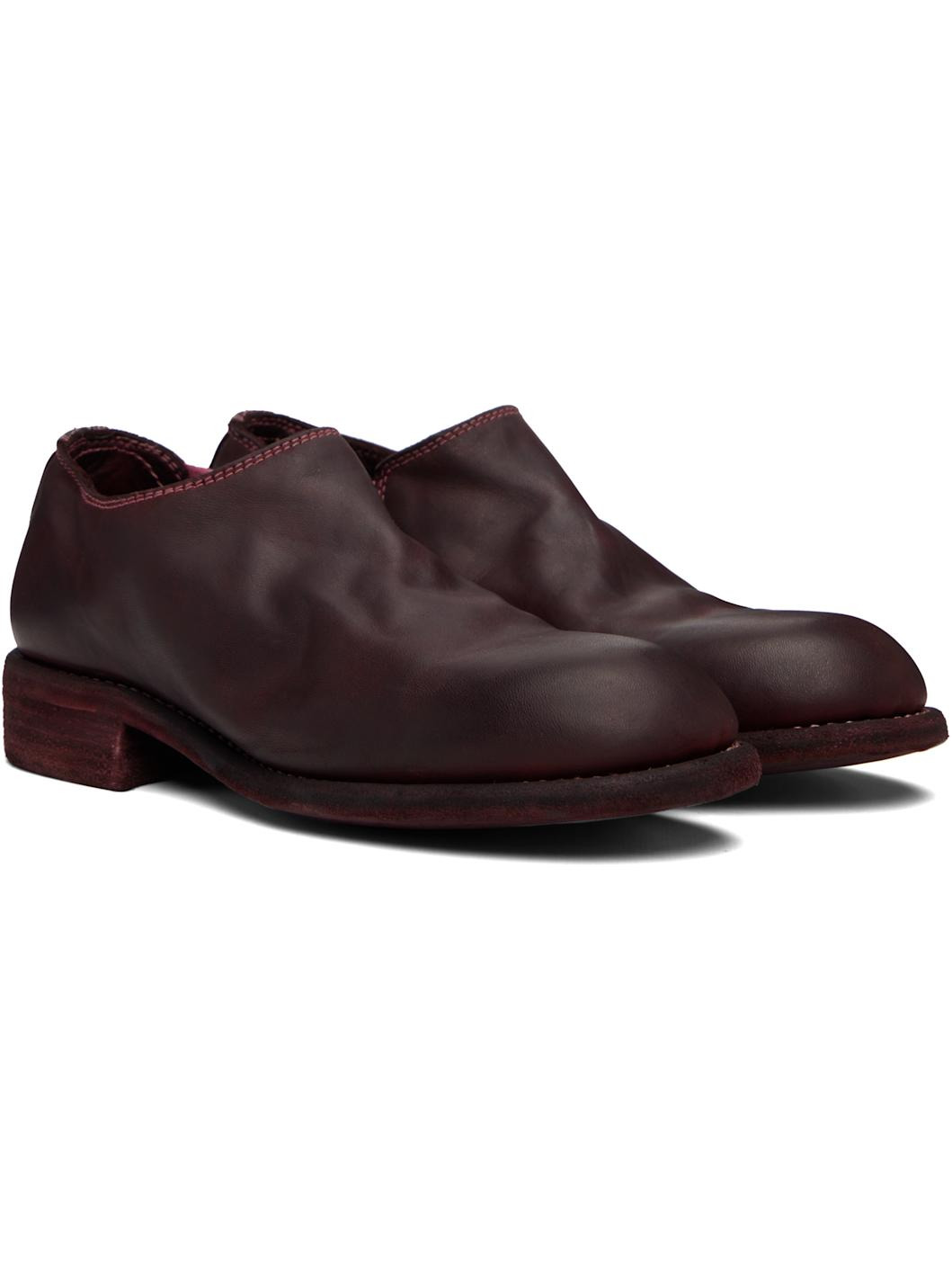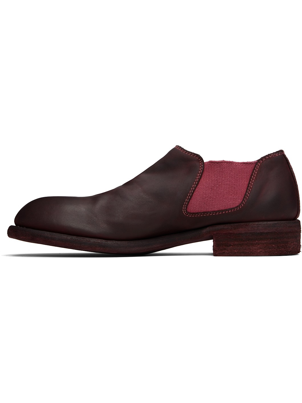 Grained horse leather slip-on loafers. · Discoloration throughout · Elasticized gusset at side · Leather lining · Distressed leather sole and block heel · Contrast stitching in pink Supplier color: Burgundy Horse leather. Made in Italy 252703F121002