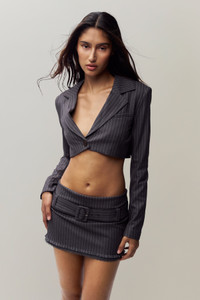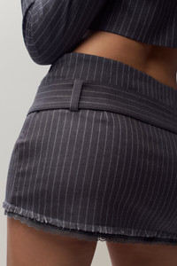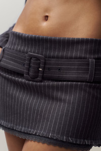 - Introducing the Andra Pinstripe Mini Skirt. This chic mini skirt features a timeless pinstripe design, with an adjustable belt for a personalized fit. A delicate lace slip peeks out, adding a touch of femininity to this skirt, ideal for any occasion from work to play. - Removable belt - Composition: 65% Polyester, 30% Rayon, 5% Spandex - Sonali is wearing a size S and is 5'10" with a 31" bust, 35" hips, and 23" waist