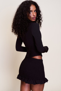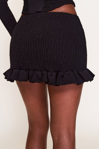 - Low-waisted smocked mini skirt with frilly lower edge. - Composition: 89% Polyester, 11% Spandex - Birta is wearing a size XS and is 5'9" with a 33" bust, 38" hips, and 23" waist