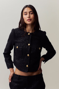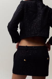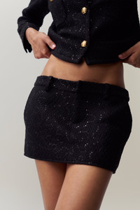 - Our new Bela Tweed Mini Skirt is perfect for dressing up or down. It pairs beautifully with our Bela Tweed Jacket for a casual day or night out. The flattering fit and eye-catching dainty micro-sequin shimmer makes this mini skirt a standout piece in any wardrobe. - Fabrication: Textured Tweed with Sequins; 100% Polyester - Sonali is wearing a size S and is 5'10" with a 31" bust, 35" hips, and 23" waist