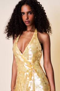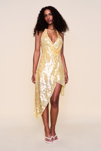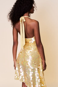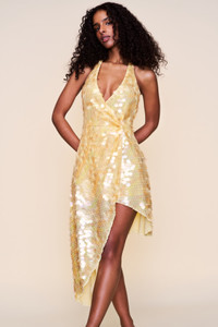 - The Besora Sequin Dress is crafted from sheer mesh layered with oversized iridescent paillettes, creating a liquid-shimmer effect that moves with you. Designed with a plunging neckline, halter tie, and open back, it wraps at the waist for a sculpted fit and falls into a fluid asymmetric hem. - Composition: 95% Nylon, 5% Elastane - Eileen is wearing a size S and is 5'9" with a 32" bust, 35" hips, and 25.5" waist