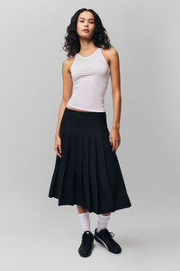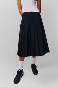 - We call it private school chic. Introducing the Gibson Pleated Skirt, the perfect iteration of everything we love about schoolgirl style. Cut to sit low on the hips with allover knife pleats, it has a mid-calf length – perfect for wearing with socks, sneakers, and a baby tee to get the full look. - Banded waist - Concealed side zip with button closure - Allover pleating - 100% Polyester - Sonali is wearing a size S and is 5'10" with a 31" bust, 35" hips, and 23" waist