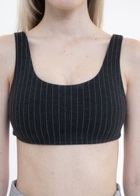 Black pin stripe sport top. Features an all-over pin stripe pattern in white. Finished with tonal stitching Slim Fit 55% Rayon, 40% Nylon, 5% Spandex Imported Model is wearing size XS Model is 5'10 (178 cm), 100 pounds (45 kg), usually wears S in tops. A size 24 in denim and XS in trousers. Size 8 in shoes.