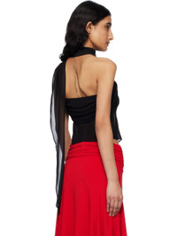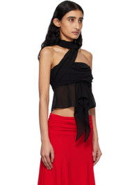 Semi-sheer polyester chiffon top. - Non-slip silicone trim at straight neck - Draping and ruching at bodice - Extended ruffled trim at cropped hem - Concealed zip closure at side seam - Wraparound scarf-style halter strap - Partial stretch satin lining Supplier color: Black