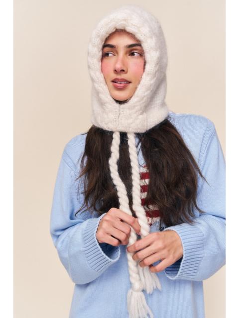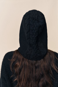 - A cloud-soft cable-knit hood with braided ties and a cozy, face-framing fit. Cold-weather comfort, elevated. - Composition: 76% Recycled Polyester, 15% Nylon, 6% Wool, 3% Spandex - One Size