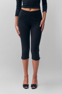 - Designed to become a staple in your wardrobe, our new heavy-weight jersey low-rise capri pants feature a flattering elastic waistband and flare slits at the hem with little bow details that add a stylish touch. - Style runs large. We recommend sizing down for a fitted look. - Composition: 60% Rayon, 34% Nylon, 6% Spandex Ponte - Ainhoa is wearing a size S and is 5'9½" with a 34" bust, 34½" hips, and 24" waist