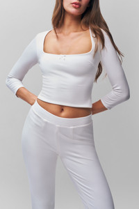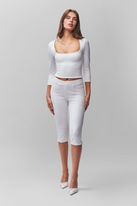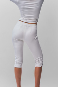 - Designed to become a staple in your wardrobe, our new heavy-weight jersey low-rise capri pants feature a flattering elastic waistband and flare slits at the hem with little bow details that add a stylish touch. - Style runs large. We recommend sizing down for a fitted look. - Composition: 60% Rayon, 34% Nylon, 6% Spandex Ponte - Ainhoa is wearing a size S and is 5'9½" with a 34" bust, 34½" hips, and 24" waist