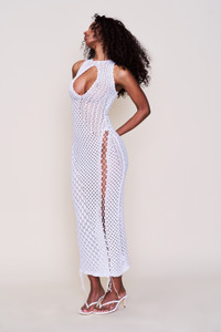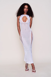 - Softly sculpted with an open knit finish, the Casmir Dress features a body-hugging silhouette with a high neckline and keyhole cutout detail. Side lace-up slits add a touch of drama and ease, revealing skin with every step. Unlined and semi-sheer—layer it over swim or wear it out when the night calls for something bolder. - Composition: 100% Cotton - Eileen is wearing a size S and is 5'9" with a 32" bust, 35" hips, and 25.5" waist