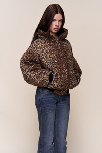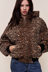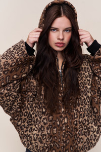 - The Charli Jacket is a relaxed hooded zip-up in a bold leopard print. Crafted from a soft polyester-wool blend, it features an oversized fit, quilted lining for added warmth, and rib knit trim at the cuffs and hem. Finished with side pockets and a full zip closure, it’s an easy statement layer for cooler weather. - Composition: 90% Polyester, 10% Wool - Noa is wearing a size S and is 5'10" with a 29" bust, 35" hips, and 23.5" waist