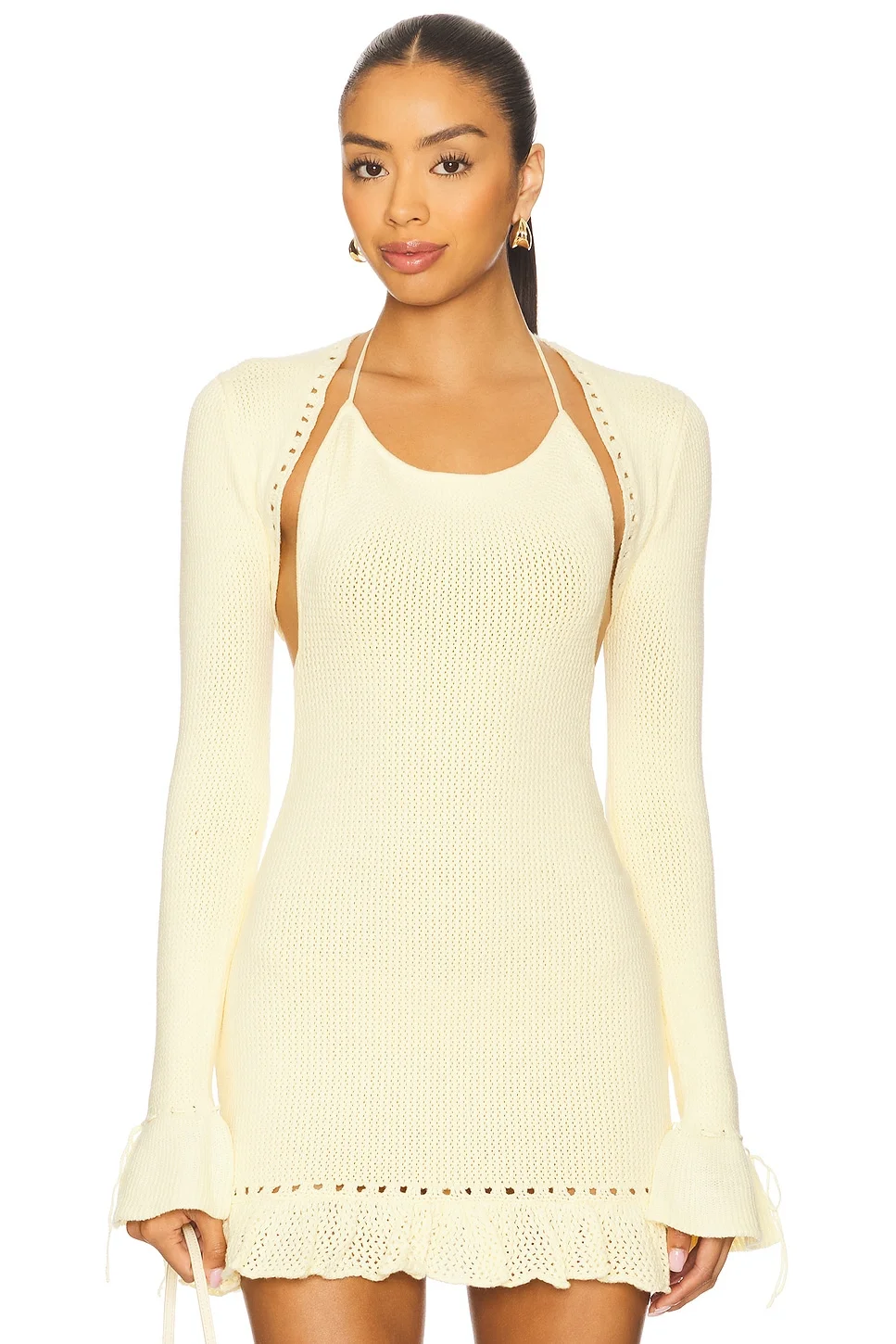 - 52% acrylic 42% cotton 6% lycra - Hand wash - Cropped fit - Flared sleeve opening - Midweight crochet fabric - Item not sold as a set - Revolve Style No. DGUI-WK51 - Manufacturer Style No. P25705S019