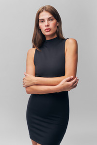 - Introducing the Donella Dress, a must-have addition to your wardrobe. Crafted from heavy-weight jersey, it boasts a flattering high neckline and an alluring open back for an extra touch of style. - Composition: 60% Rayon, 34% Nylon, 6% Spandex Ponte - Ainhoa is wearing a size S and is 5'9½" with a 34" bust, 34½" hips, and 24" waist