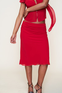 - The Eda Skirt, made of elegant chiffon, offers a ruched waistline with a side zipper for functionality. Designed in a flattering midi length, this skirt is double-lined and effortlessly flowy. We recommend pairing with the Ara Top. - Composition: 100% Polyester - Eileen is wearing a size S and is 5'9" with a 32" bust, 35" hips, and 25.5" waist