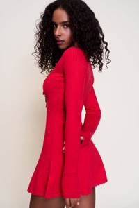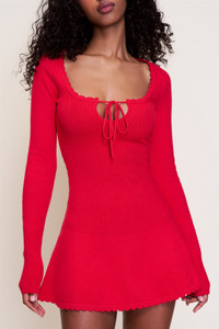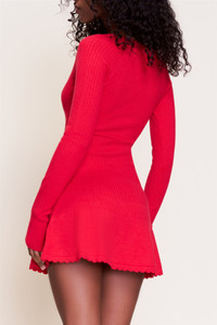 - Introducing the Evelyne Dress – the ultimate mix of playful and seductive, made from ultra-soft sweater knit fabric. Its flattering drop waist design offers a relaxed, effortless fit, perfect for everything from laid-back days to elevated, chic looks. This knit mini dress features a cute scalloped hem and a tie-front closure for an extra touch of charm. - Composition: 50% Viscose, 28% Polyester, 22% Nylon - Birta is wearing a size XS and is 5'9" with a 33" bust, 38" hips, and 23" waist
