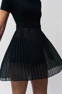 Yada is wearing a size XS and is 5'9" with a 32" bust, 34" hips, and 24" waist - Introducing the Evie Dress, a perfect blend of comfort and style. Featuring a cozy sweater detail paired with elegant chiffon pleating, this dress exudes sophistication while ensuring you stay comfortable all day long. The separate short underneath provides added coverage and ease of movement, making it ideal for both casual outings and special occasions. - Composition: 50% Rayon 22% Nylon 28% Polyester - Yada is wearing a size XS and is 5'9" with a 32" bust, 34" hips, and 24" waist