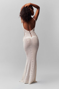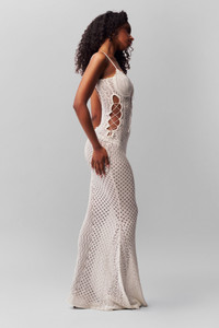 - Maxi dress made of tightly woven crochet fabric, featuring an open back, side tie accents, and adjustable straps. - Composition: 100% Cotton - Dani is wearing a size S and is 5'10" with a 32" bust, 35" hips, and 25" waist