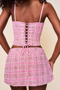 - Pleated mini skirt with built-in shorts, perfect for day-to-night. Features a charming gingham fabric with delicate flower accents. - Composition: 89% Polyester, 5% Chinlon, 3% Wire, 3% Sequins - Eileen is wearing a size S and is 5'9" with a 32" bust, 35" hips, and 25.5" waist
