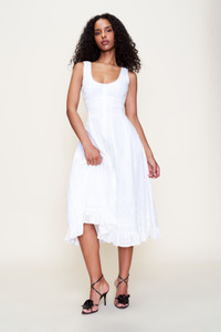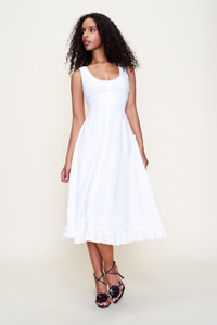 - The Florrie Eyelet Midi Dress is an ode to vintage femininity. Crafted from airy 100% cotton, it features delicate eyelet embroidery, a softly structured bodice, and an A-line midi skirt with a scalloped ruffle hem. A tie at the back cinches the waist for a flattering, adjustable fit. Light, breathable, and effortlessly romantic—perfect for warm days and lingering evening - Composition: 100% Cotton - Eileen is wearing a size S and is 5'9" with a 32" bust, 35" hips, and 25.5" waist