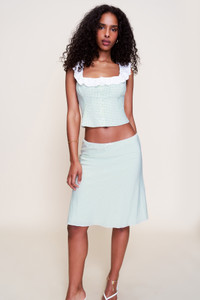 - Pull-on gingham midi skirt featuring scalloped waist, a flounced hem, and an elastic waistband. - Composition: 58% Polyester, 36%Rayon, 6% Nylon - Eileen is wearing a size S and is 5'9" with a 32" bust, 35" hips, and 25.5" waist
