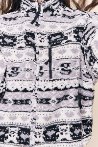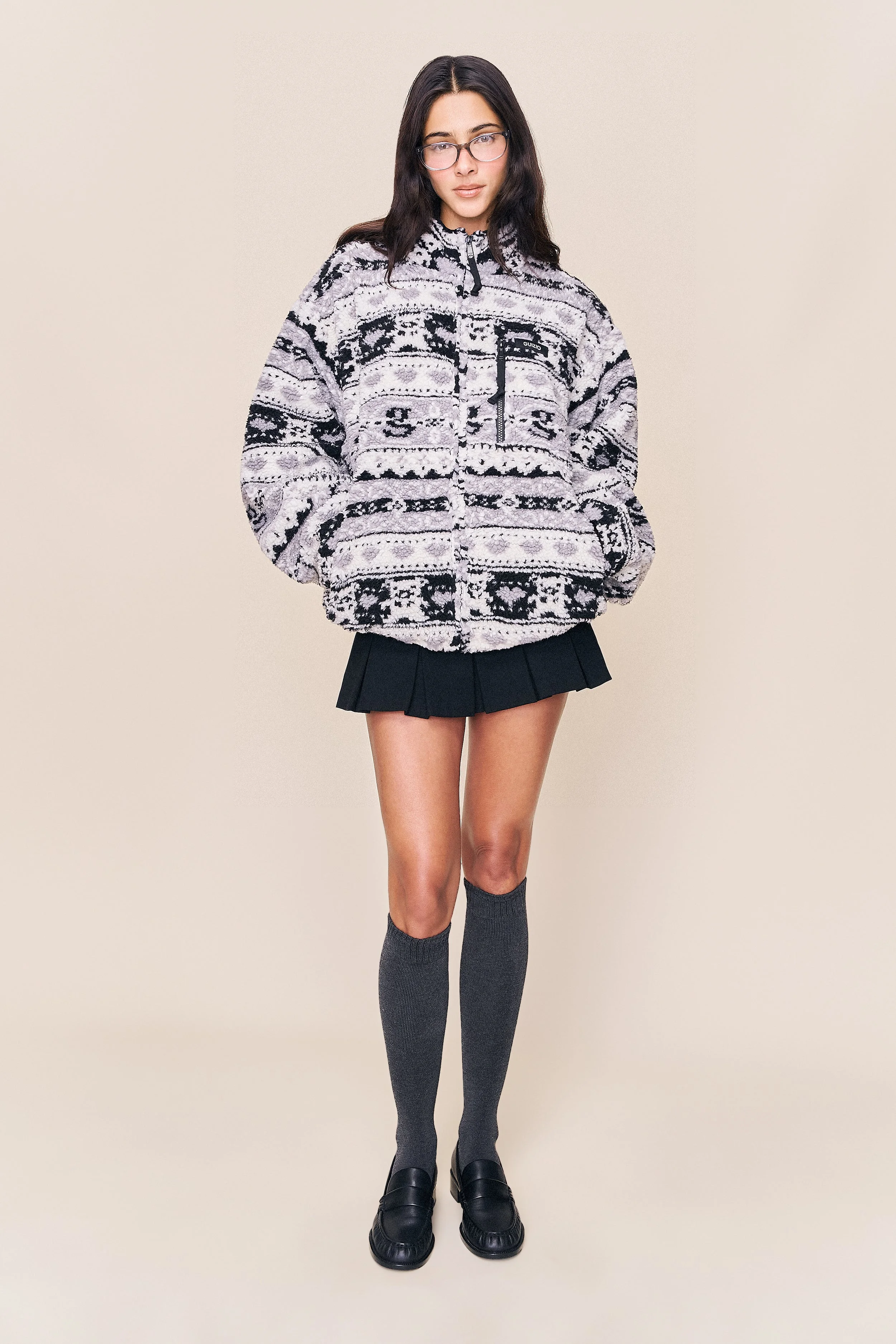 - An elevated take on everyday comfort. The Guizio Sherpa Zip Up Jacket features plush animal-print fleece with contrast nylon detailing and functional zip pockets. Designed with an oversized fit that layers effortlessly. - Composition: 100% Polyester - Brittany is wearing a size M and is 5'10" with a 32" bust, 34.5" hips, and 22.5" waist