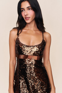 - The Halo Mini Dress features a sleek, fitted silhouette with delicate spaghetti straps, a square neckline, and an empire waist finished with a satin ribbon detail. Crafted in allover bronze sequin fabrication. - Composition: 90% Polyester, 10% Elastane - Brittany is wearing a size S and is 5'10" with a 32" bust, 34.5" hips, and 22.5" waist