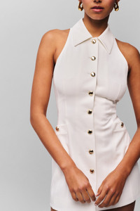 - Introducing our Isla Dress with a high collar, gold buttons, and adjustable back. Perfect for any occasion. - Composition: 80% Polyester 15% Rayon 5% Spandex - Birta is wearing a size S and is 5'9" with a 33" bust, 38" hips, and 23" waist