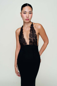 - The Lillia Dress is evening elegance distilled—crafted in fluid black with a daring lace halter plunge that drapes into an open back. A floor-length silhouette skims the body, balancing romantic lace with a sultry, minimal frame. - Composition: 100% Polyester - Shannon is wearing a size S and is 5'9" with a 32" bust, 34.5" hips, and 24" waist