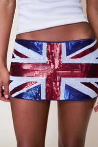 - The London Town Mini Skirt features a low-rise fit and Union Jack–inspired design in allover sequins. A sharp, nostalgic piece with a clean silhouette made to stand out. - Composition: 97% Polyester, 3% Spandex - Eileen is wearing a size S and is 5'9" with a 32" bust, 35" hips, and 25.5" waist