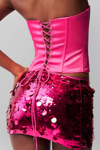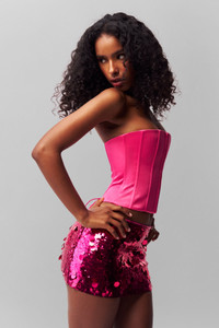 - Meet the Low-Rise Paillette Skirt – the Signature style favorite. It glitters from a mile away with sequin and paillette embellishing that fully covers the fitted shape. We like it best worn with a simple top so this Guizio staple can dazzle on its own. - Composition: 90% Polyester, 10% Spandex - Eileen is wearing a size S and is 5'9" with a 32" bust, 35" hips, and 25.5" waist