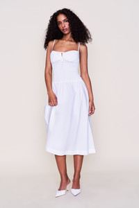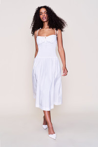 - Soft, simple, and endlessly wearable. The Lura Midi Dress is designed in a crisp cotton blend with a ruched bodice, adjustable tie at the bust, and slim straps. A smocked waist defines the shape, while the full A-line skirt falls to mid-calf—and includes hidden side pockets for extra ease. Lightweight and easy, it’s perfect for sun-soaked days or dressed up with a heel for night. - Composition: 95% Cotton, 5% Spandex - Eileen is wearing a size S and is 5'9" with a 32" bust, 35" hips, and 25.5" waist