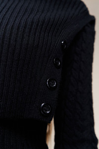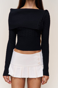 - The Lureta Sweater is crafted from a soft ribbed knit featuring a fold-over asymmetric neckline secured by tonal button detailing. Designed for a close, flattering fit with subtle cable-knit texture through the body and sleeves. A modern silhouette that blends warmth with quiet sophistication. - Composition: 50% Nylon, 35% Wool, 15% Acrylic - Sonali is wearing a size S and is 5'10" with a 31" bust, 35" hips, and 23" waist