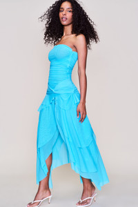 - Effortlessly stunning, the Lyla Twist Dress offers a strapless silhouette with delicate mesh fabric and a unique twist detail. Perfect for any occasion, this midi dress will make you feel confident and chic. - Composition: 90% Nylon, 10% Spandex - Eileen is wearing a size S and is 5'9" with a 32" bust, 35" hips, and 25.5" waist