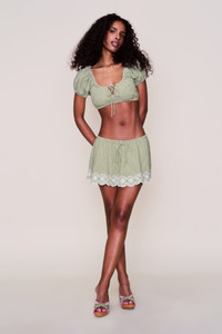 - The Maelle Mini Skirt is crafted in soft red gingham with a scalloped daisy lace hem and a functional drawstring waist for a customizable fit. Lightweight and fully lined, it’s perfect tossed over a bikini or styled with the matching Ravello Top—a sweet set made for golden hours, morning markets, and everything in between. - Composition: 65% Polyester, 35% Cotton - Eileen is wearing a size S and is 5'9" with a 32" bust, 35" hips, and 25.5" waist
