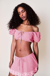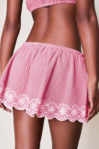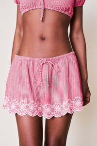 - The Maelle Mini Skirt is crafted in soft red gingham with a scalloped daisy lace hem and a functional drawstring waist for a customizable fit. Lightweight and fully lined, it’s perfect tossed over a bikini or styled with the matching Ravello Top—a sweet set made for golden hours, morning markets, and everything in between. - Composition: 65% Polyester, 35% Cotton - Eileen is wearing a size S and is 5'9" with a 32" bust, 35" hips, and 25.5" waist