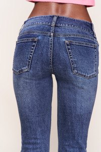 - The return of a classic. The Malia Jean sits low on the hips with a double belt-loop waistband and buttoned tab detail. Cut with a slim fit through the thigh and a subtle flare at the hem, it’s finished with back patch pockets and vintage-inspired fading. - Composition: 99% Cotton, 1% Spandex - Eileen is wearing a size 26 and is 5'9" with a 32" bust, 35" hips, and 25.5" waist