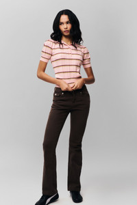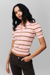 - Meet our Mateo Polo, a short puff sleeve polo with a ribbed collar and button closure. - Composition: 50% Viscose, 28% Polyester, 22% Nylon - Thalita is wearing a size S and is 5'9" with a 32" bust, 35" hips, and 23" waist