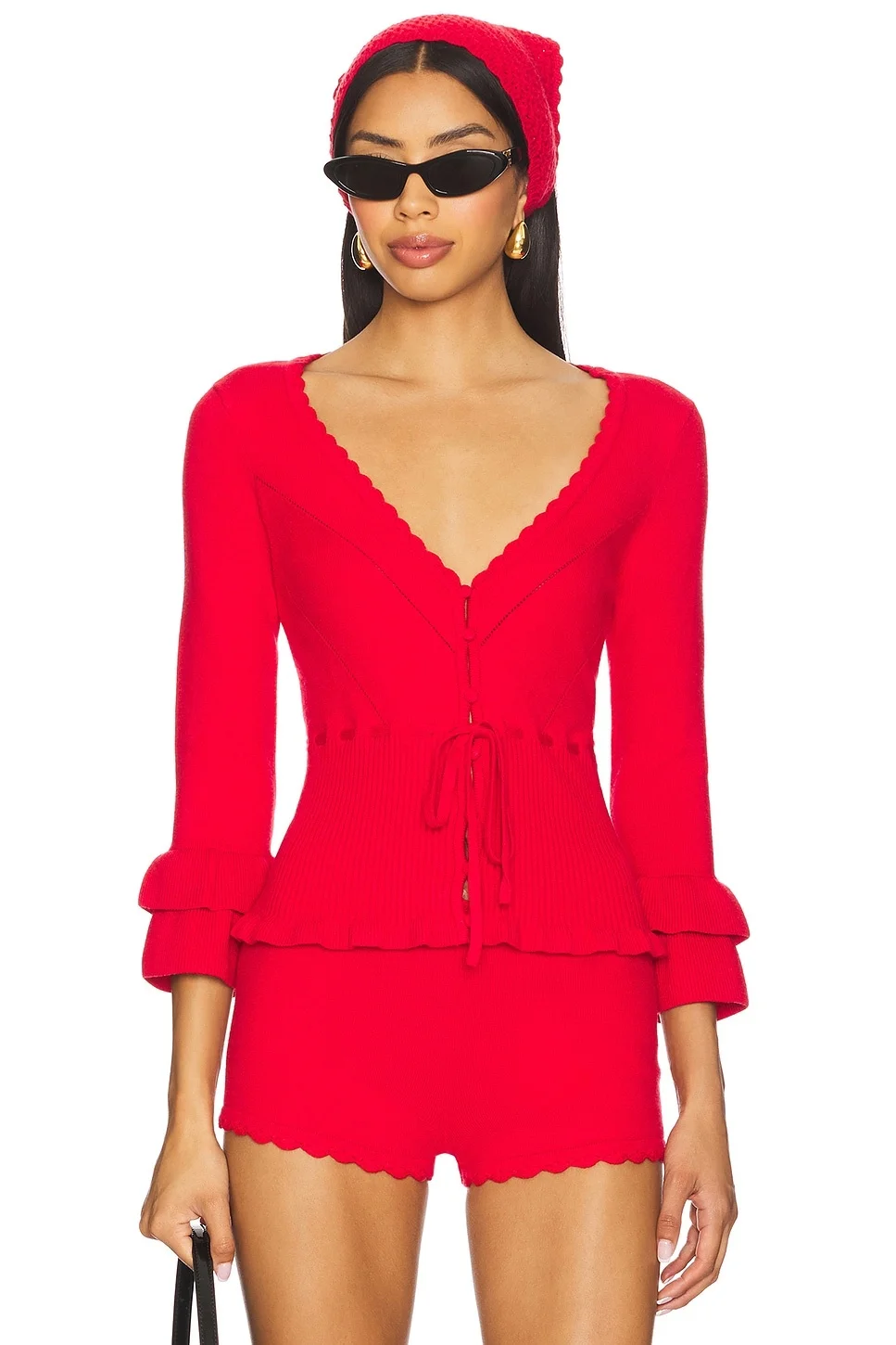 - 50% rayon 22% nylon 28% polyester - Hand wash - Pull-on styling - Front faux button closure with tie accent - Ruffle sleeves - Scalloped trim - Midweight knit fabric - Item not sold as a set - Revolve Style No. DGUI-WS194 - Manufacturer Style No. S25111S052