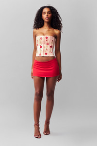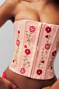 You've probably met our Satin Corset – a true closet hero. Our latest version is freshly embroidered with bright flowers, and embellished with rhinestones and tiny pearls. It features everything we love about a classic corset: boned structure, boudoir-style hook-and-eye closures and a lattice back. More than an occasion top, you can wear it over and under all of your favorite pieces. - Strapless neckline - Front hook-and-eye closures - Lattice back closure - Boned bodice - 100% Polyester - Model measurements: Height 5’9”, Bust 31”, Waist 23.5”, Hips 35” - Model is wearing a size XS