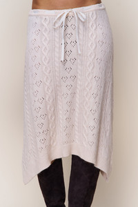 - The Noah Wool Cable Skirt completes a set in a slouch-meets-sleek silhouette. Crafted in the same intricate cable knit as the Noah WoolCable Crop Cardigan, it drapes with ease into an asymmetric hemline. A contrast ribbon tie cinches the waist, adding a playful detail to an otherwise minimal knit essential. - Composition: 45% Nylon, 45% Viscose, 5% Angora Wool, 5% Wool - Sonali is wearing a size S and is 5'10" with a 31" bust, 35" hips, and 23" waist