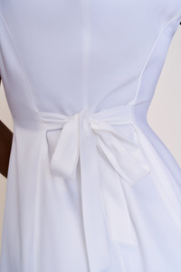 - The iconic Paloma set, reimagined as a one-piece. Lace-trimmed square neckline, fitted bodice, and soft flare through the skirt. Finished with an adjustable waist tie for shape. - Composition: 100% Polyester - Eileen is wearing a size S and is 5'9" with a 32" bust, 35" hips, and 25.5" waist